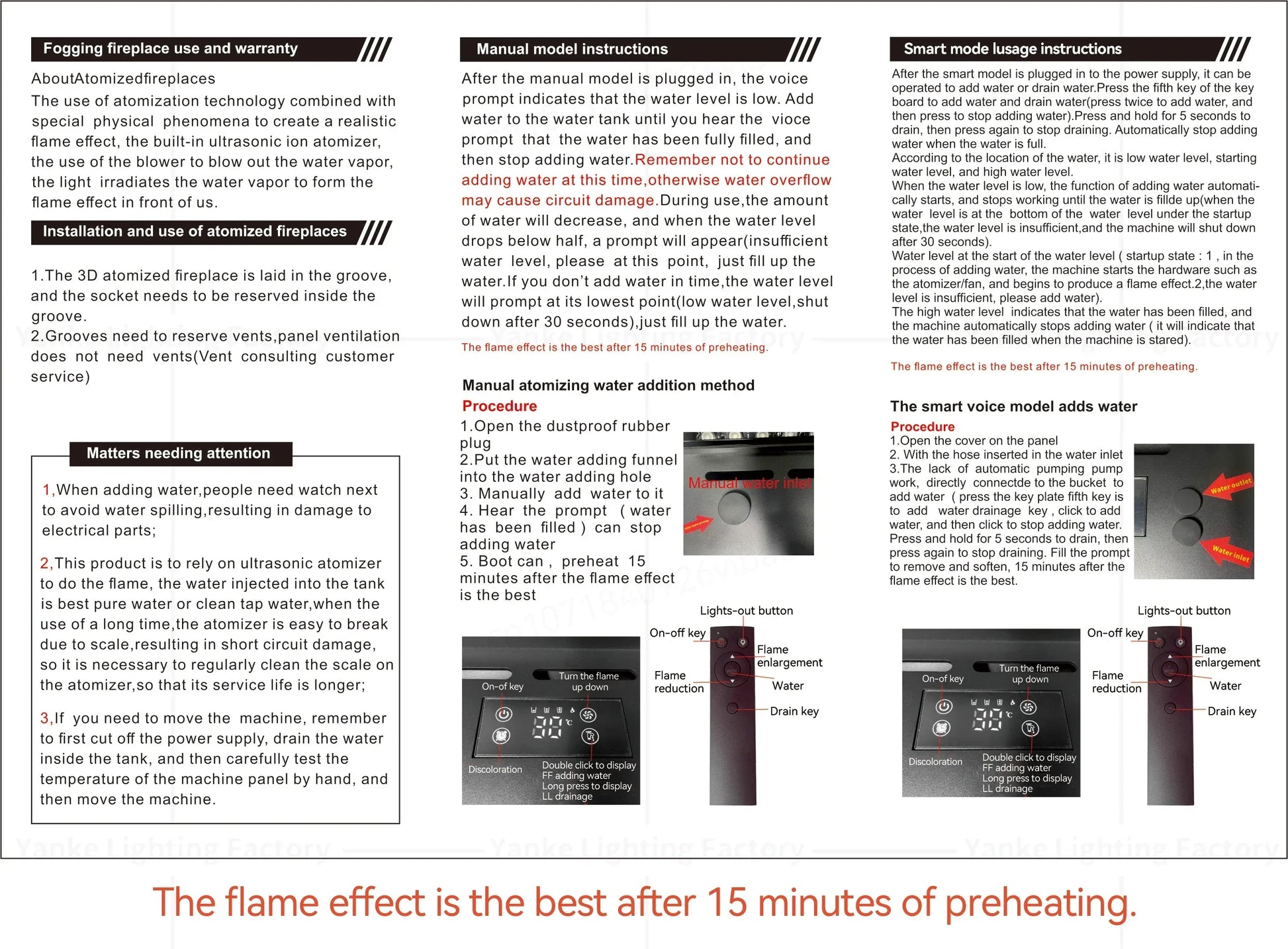 4. In oder to extend life of burner, suggest used purified water, in case dirt of water lead to fireplace unable to work after long time used.