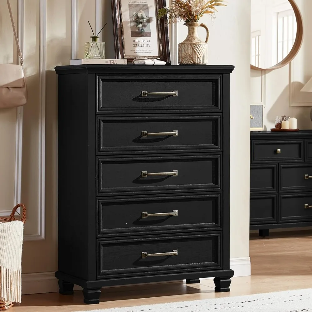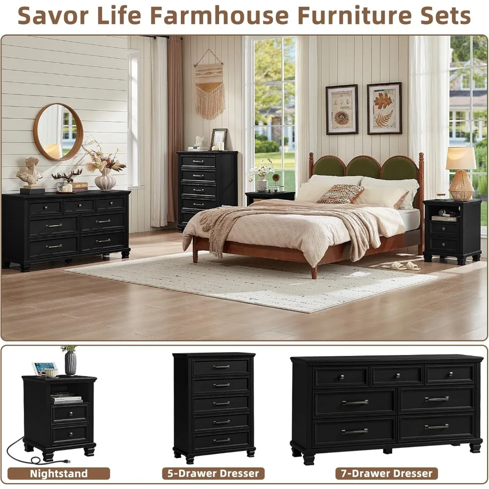 This four-piece bedroom collection from ANGDUO merges farmhouse aesthetics with contemporary design, featuring a choice of 5 or 7-drawer dressers paired with two matching nightstands.